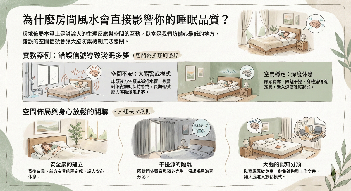 當我們談論環境佈局時,本質上是在討論人的生理反應與空間的互動。臥室是每個人待最久、也是防備心最低的地方,如果空間佈局讓人感到不安,大腦的防禦機制就無法完全關閉。