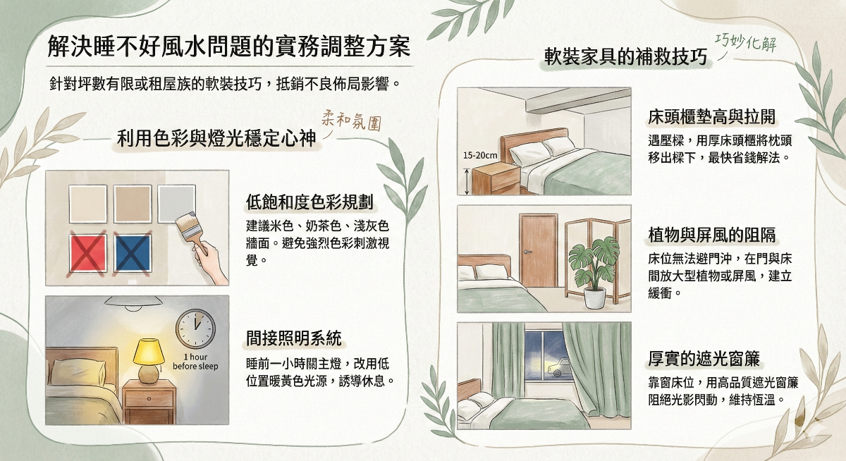 2. 植物與屏風的阻隔: 如果床位無法避開門沖,可以在門與床之間擺放一盆大型綠色植物(如龜背芋)或是簡單的屏風,建立一道緩衝帶。