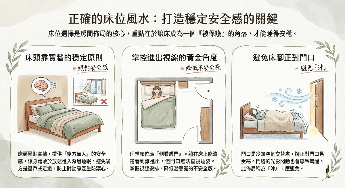 理想的床位應該是「側看房門」。也就是說,當你躺在床上時,能清楚看到誰進出房間,但門口的人無法第一時間直視你的睡姿。這種具備掌控權的視線安排,能大幅降低潛意識中的不安全感,對改善睡不好很有幫助。