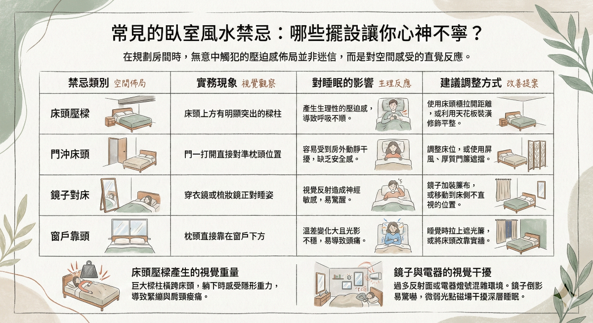在規劃房間時,我們常會為了追求採光或收納空間,無意中觸犯了一些會讓人產生壓迫感的佈局。這些禁忌並非迷信,而是人類對空間感受的直覺反應。