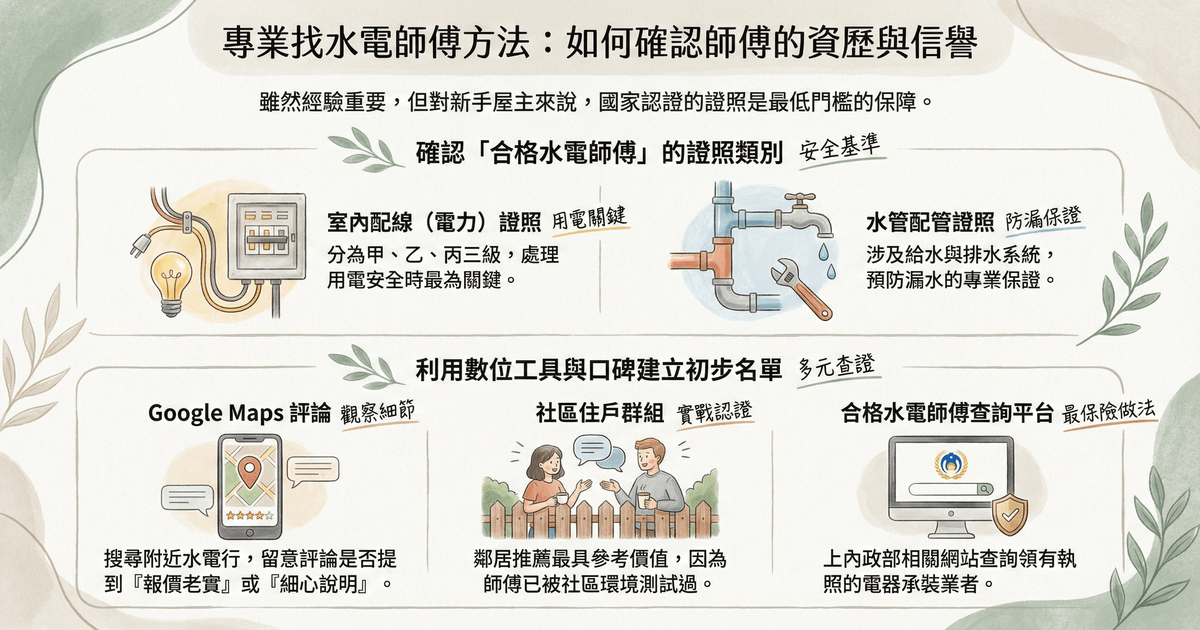 在台灣,水電從業人員是有明確的國家認證標準的。雖然許多老經驗的師傅沒拿證照也能修得很好,但對於新手屋主來說,看證照是最低門檻的保障。