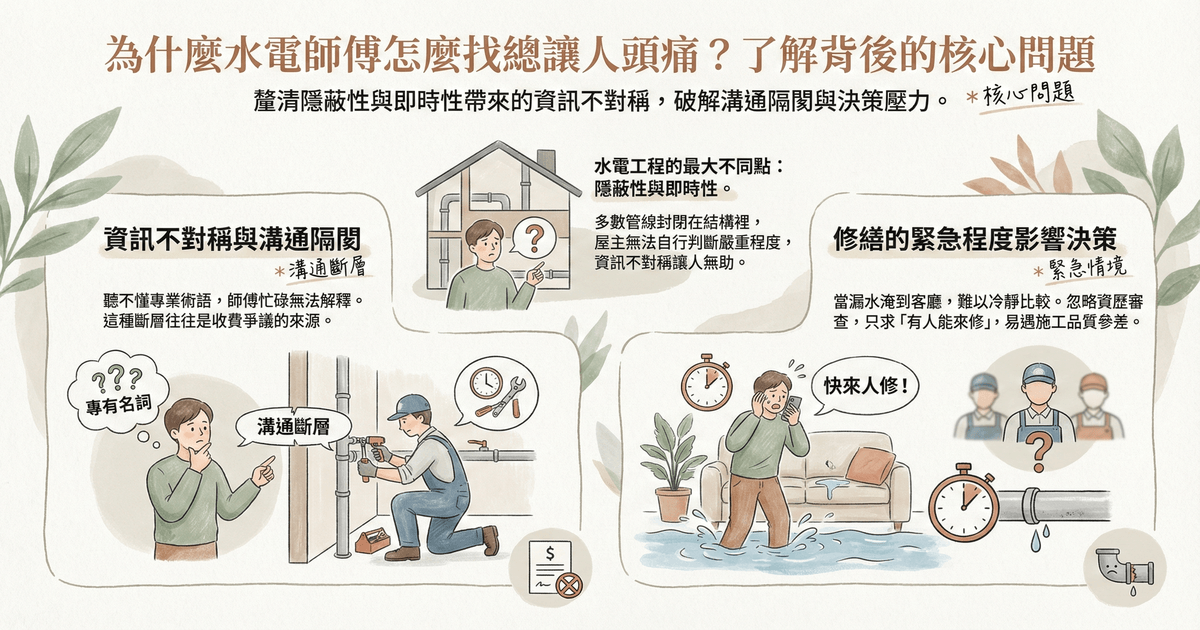 當家中的水龍頭開始不停滴水,或是插座突然冒出火花時,多數人第一時間的反應往往是焦慮。水電問題通常隱藏在牆面與天花板之後,這種「看不見」的特性,加上施工專業門檻高,讓找師傅這件事變得像是一場博弈,擔心修不好、怕被收費不公,更怕留下安全隱患。這篇文章將帶你從源頭理解水電工程的邏輯,並分享五個務實的找師傅原則,幫助你建立一套篩選標準,從此不再為了修繕家裡而手忙腳亂。